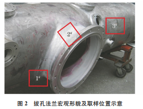 拔孔法蘭宏觀形貌如圖2所示,從法蘭上取樣, 取樣位置如圖2所示,共取3處試樣,1# 位置與2#位置相互垂直,3# 位置為殼體正常部位。