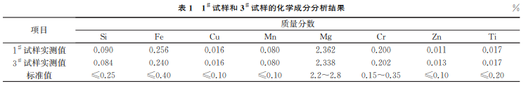 該殼體主筒體和支筒體材料均為5052-O 態(tài)鋁 合金,將主筒體局部開口并對其拔孔,主筒體與支筒體形成對接環(huán)焊縫。為驗證筒體各部分材料,尤其 微裂紋部位的材料是否滿足要求,采用直讀光譜儀 分別對有裂紋試樣(1# 試樣)和正常試樣(3# 試樣) 進行化學成分分析,結(jié)果如表1所示。由表1可知: 其化學成分符合GB/T3190—2008《變形鋁及鋁合 金化學成分》對5052鋁合金的要求。