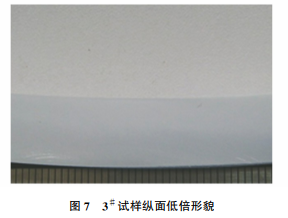 將1# ,2# ,3# 試樣分別沿縱面剖開,磨拋試樣 后,用 15%(體積分數(shù))的 NaOH 溶液浸泡試樣 2min,再將試樣置于光學顯微鏡下觀察,結(jié)果如 圖5~7所示,其中1# 試樣存在黑色異常區(qū)域,經(jīng)確 認黑色部位為過燒區(qū)域[11]。