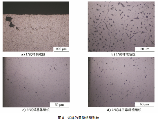 對1# ,2# ,3# 試樣分別進行磨光、拋光,并用 體積分數(shù)為0.5%的氫氟酸分別對試樣進行腐 蝕,利用光學顯微鏡對試樣進行金相檢驗[12],結(jié) 果如圖8所示。由圖8可知:1# 試樣裂紋深度約 為0.208mm,沿晶界分布;黑色區(qū)域組織晶界已 復熔、變寬,β相聚集長大且存在復熔球,屬于嚴 重過燒組織;α固溶體基體上分布著β等相,組織 正常。
